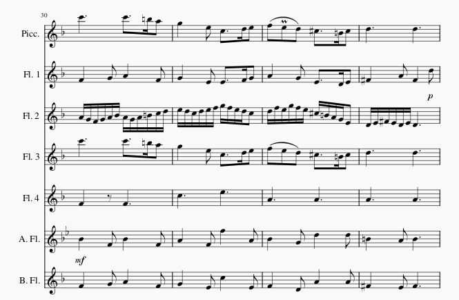 Flute 2 – the most challenging part with beautiful sixteenth-note accompanying passages