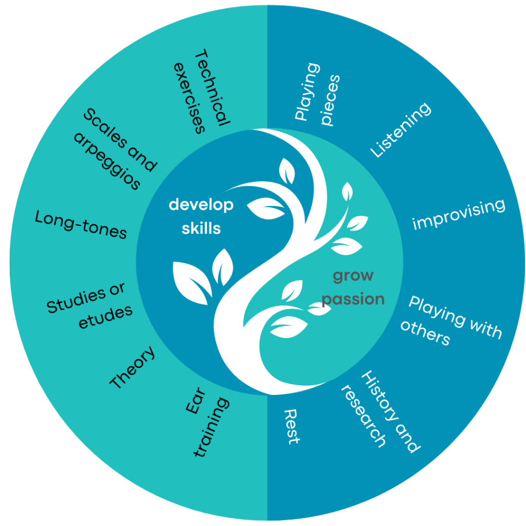 If you have a lot of time in a week and lots of energy, you may want to spend more time focusing on the skill-developing activities like scales, technical exercises, and studies. If you have a busy, stressful week, it’s better to enjoy your practice by playing beautiful music, or even doing some listening!